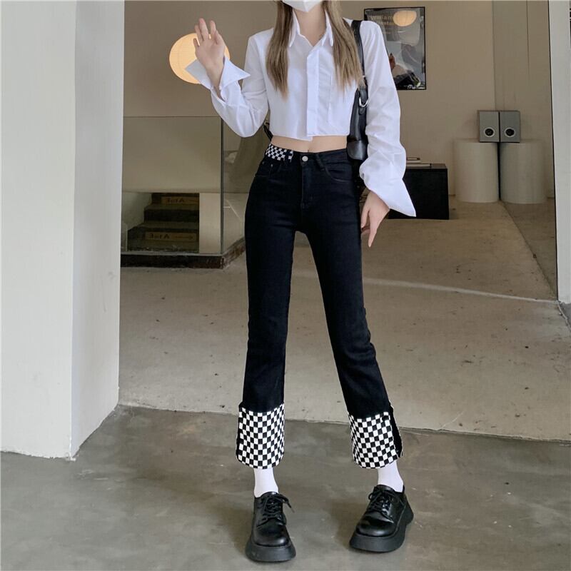 折り返しがチェッカーフラッグ柄になっている、女の子らしいデニムパンツです。