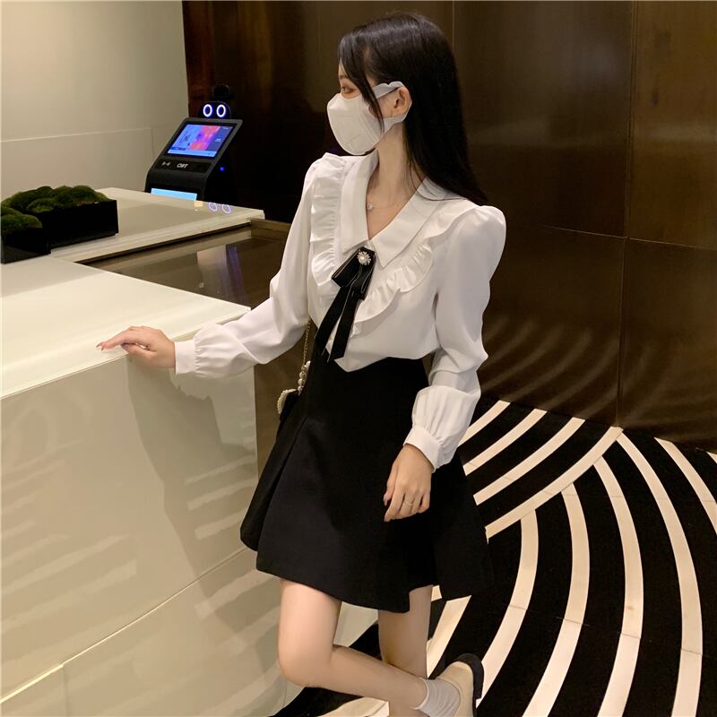 スカート ブラウス ショート丈 膝上 無地 フリル リボン かわいい 大人可愛い カジュアル おしゃれ お洒落 大人可愛い 大人女子 ラブリー キュート ガーリー ショート 袖あり 上下セット 2点セット 白 ホワイト 黒 ブラック S M L 10代 20代 デート お出かけ 女子会 お泊まり 休日 ファッション コーデ スタイル 送料無料 | Rena 韓国ファッション レディースアパレル