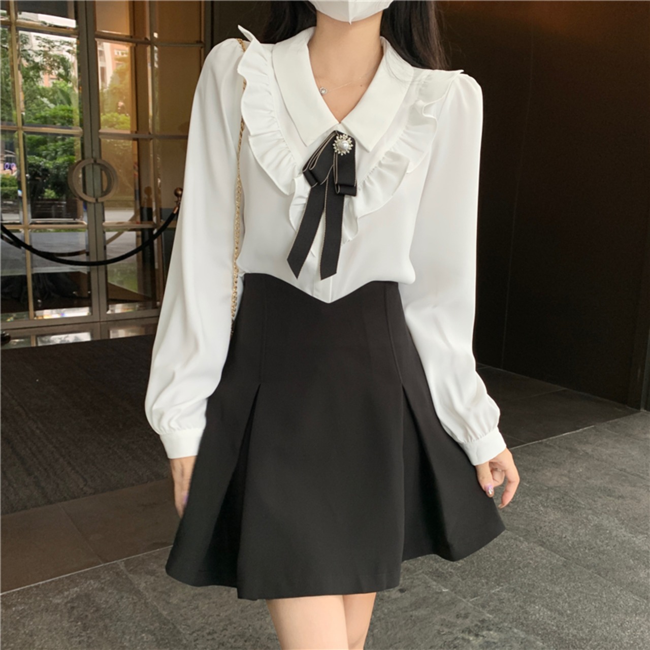 スカート ブラウス ショート丈 膝上 無地 フリル リボン かわいい 大人可愛い カジュアル おしゃれ お洒落 大人可愛い 大人女子 ラブリー キュート ガーリー ショート 袖あり 上下セット 2点セット 白 ホワイト 黒 ブラック S M L 10代 20代 デート お出かけ 女子会 お泊まり 休日 ファッション コーデ スタイル 送料無料