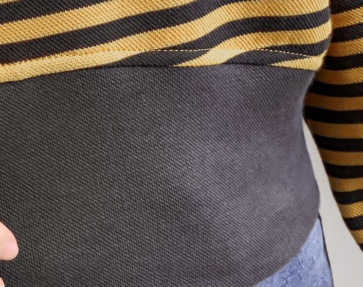 ウエスト部分を無地にすることで、見た目のウエストの位置が上がって、足を長く見せてくれる嬉しい一枚。