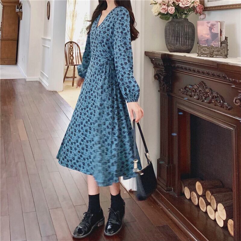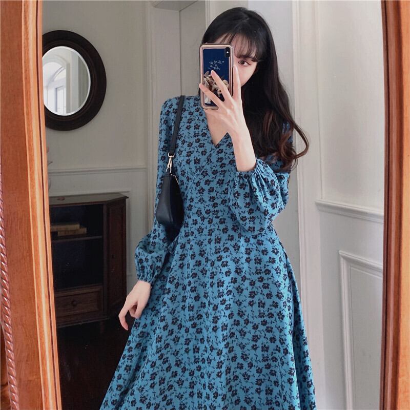 ワンピース フレアワンピース 膝丈 ミモレ丈 長袖 小花柄 春 秋 冬 フレア Aライン かわいい 大人可愛い きれいめ シンプル 上品 おしゃれ お洒落 大人女子 こなれ感 ラブリー キュート ガーリー Vネック 襟なし 緑 グリーン L XL 2XL 3XL 4XL 10代 20代 30代 OL 通勤 学生 通学 デート お出かけ 公園デビュー 女子会 お泊まり 普段使い ファッション コーデ スタイル モテ 送料無料 | Rena 韓国ファッション レディースアパレル