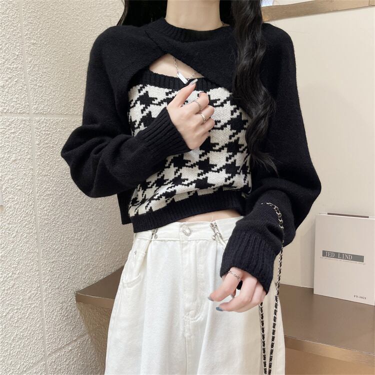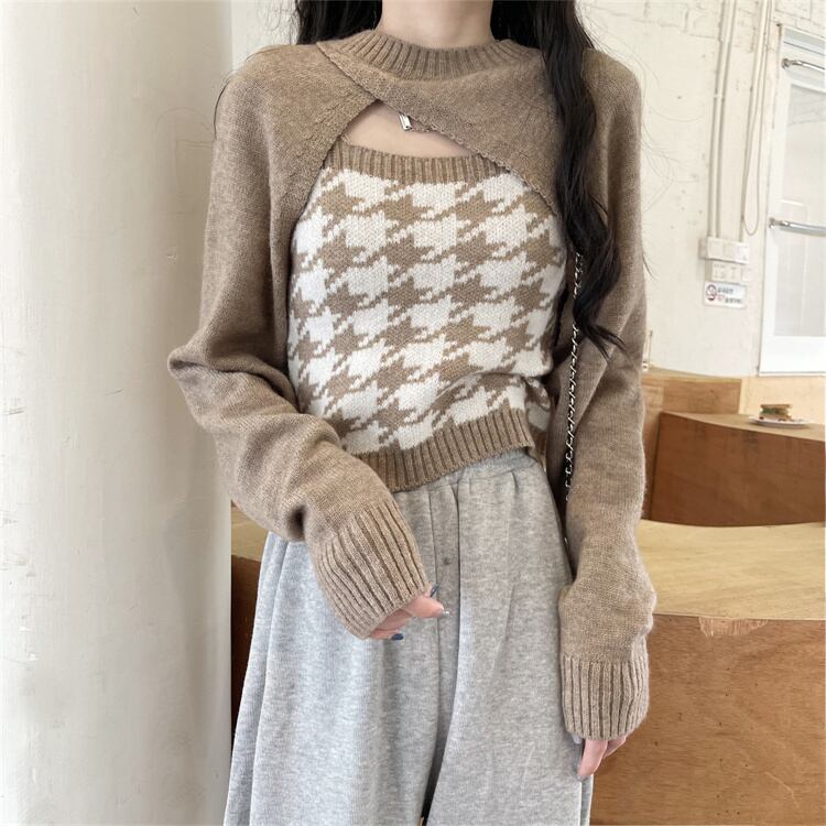 ニット カーディガン 長袖 千鳥格子 春 秋 冬 かわいい 大人可愛い 大人 上品 おしゃれ お洒落 かっこいい 大人女子 こなれ感 ガーリー 2点セット ツーピース 黒 ブラック 茶色 ブラウン 灰色 グレー アプリコット 10代 20代 30代 OL 通勤 学生 通学 デート お出かけ 女子会 お泊まり 重ね着 ファッション コーデ スタイル モテ 送料無料 | Rena 韓国ファッション レディースアパレル