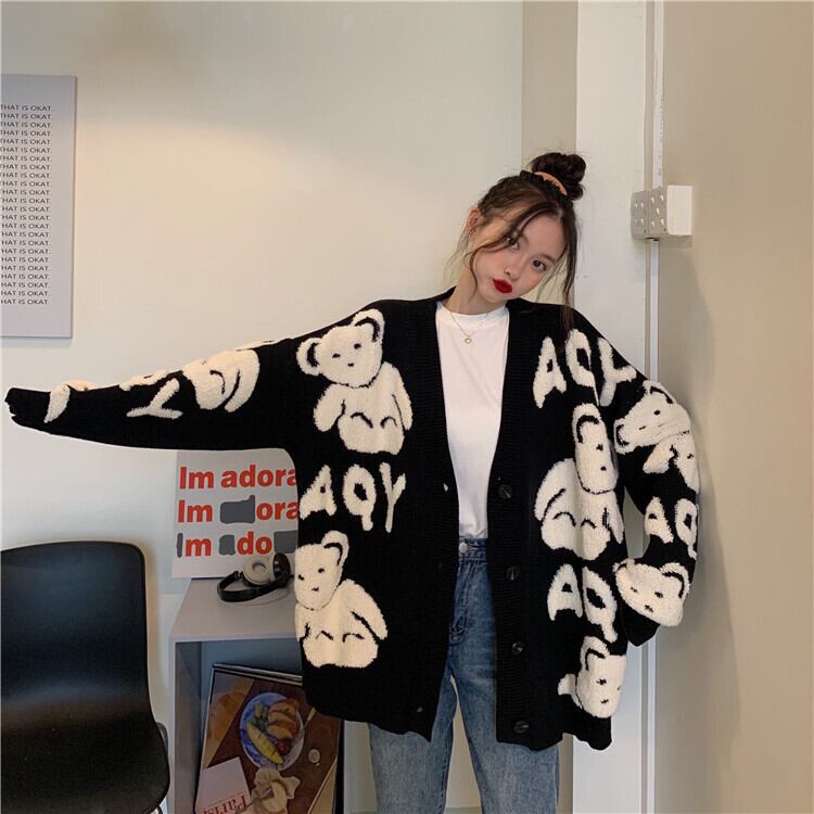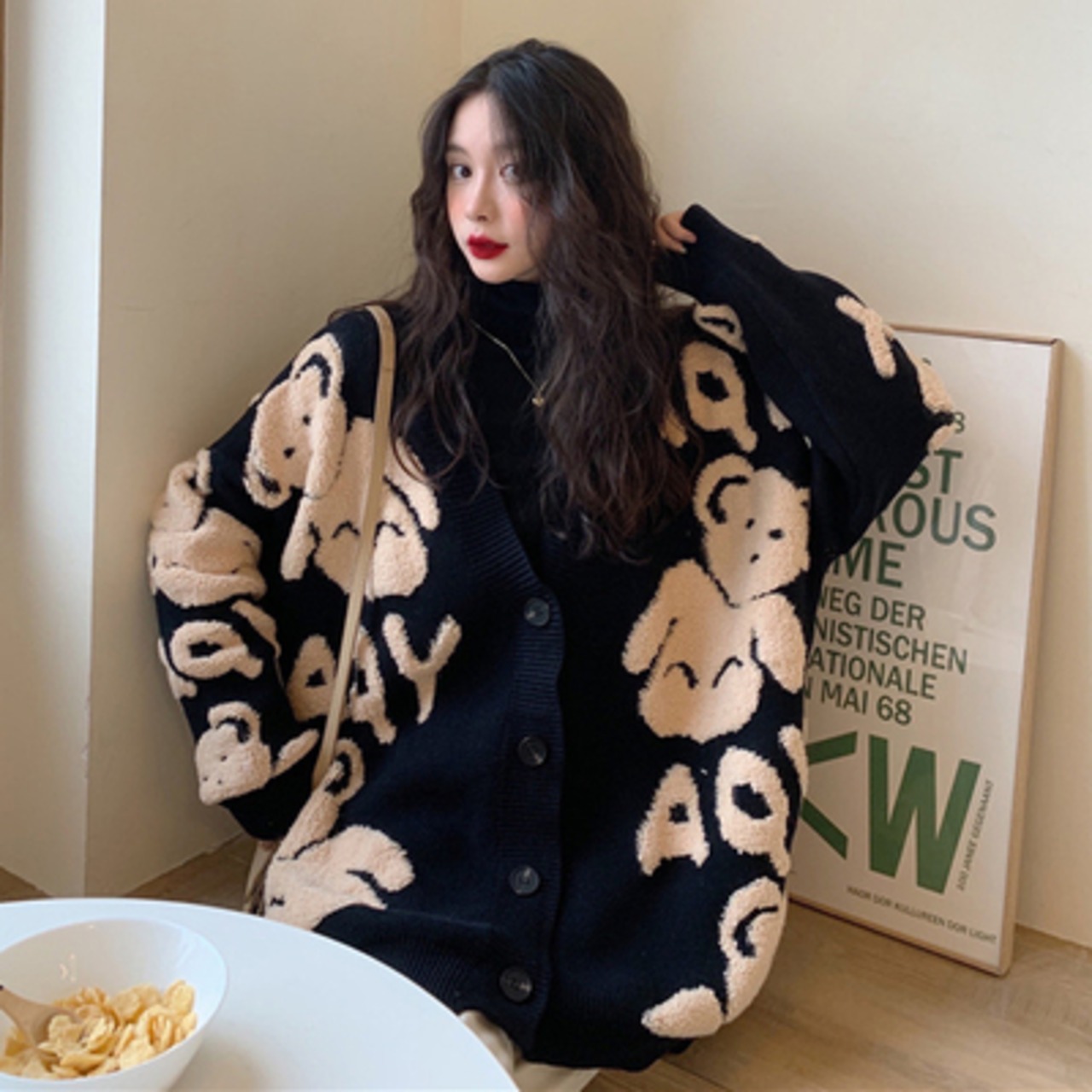 全面にあしらわれたベアの柄がかわいい、デザインカーディガンです。