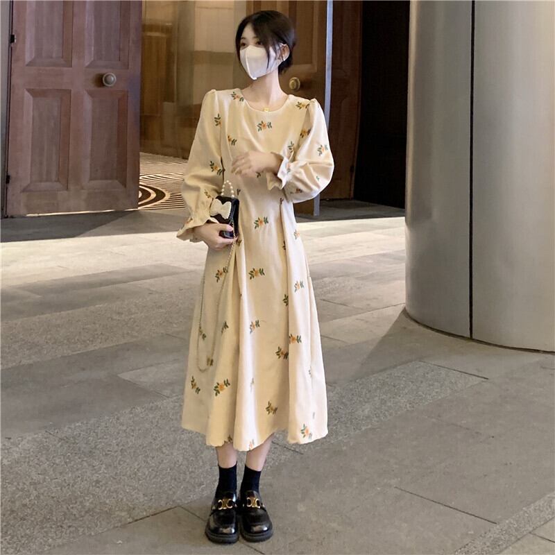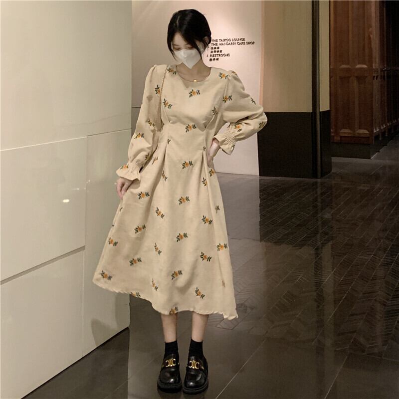 ワンピース Aラインワンピース ミモレ丈 長袖 花柄 春 秋 冬 フレア 細身 Aライン フリル ウエストマーク かわいい 大人可愛い レトロ こなれ感 ラブリー キュート ガーリー Uネック ミモレ パフスリーブ ブラック アプリコット S M L 10代 20代 30代 女性用 デート お出かけ 女子会 休日 旅行 着回し 普段使い 韓国 韓国系 オルチャン ファッション コーデ スタイル | Rena 韓国ファッション レディースアパレル