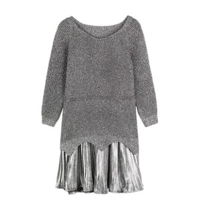 ニット キャミソールワンピース ショート丈 長袖 無地 秋 冬 プリーツ 2way かわいい カジュアル ラブリー キュート ガーリー ルーズ ラウンドネック ショート ひざ丈 2点セット グレー M L XL 2XL 3XL 4XL 10代 20代 女性用 デート お出かけ 休日 着回し 普段使い 重ね着 ファッション コーデ スタイル 美脚 脚長 | Rena 韓国ファッション レディースアパレル