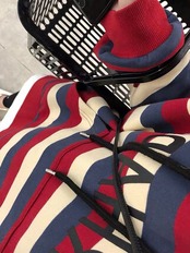 レッド☓ネイビー☓ホワイトのストライプで、ポップな着こなしに合う一枚。