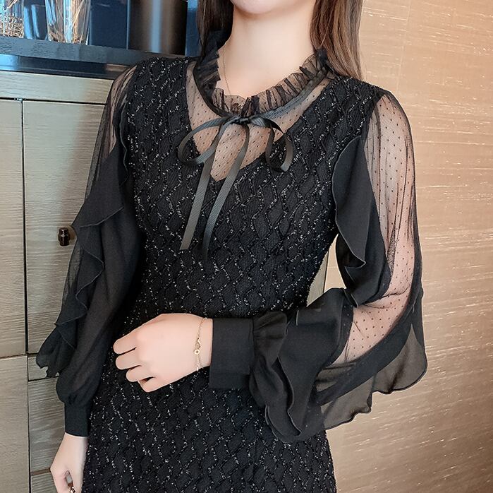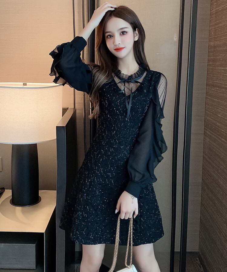 ワンピース ドレス 二次会 Aラインワンピース 膝上 長袖 柄 セミフレア Aライン リボン 透け感 かわいい きれいめ おしゃれ お洒落 ラブリー キュート ガーリー 存在感 クルーネック ショート ひざ丈 パフスリーブ ワンピドレス ブラック S M L XL 2XL 3XL 4XL 10代 20代 女性用 デート 女子会 パーティー イベント 結婚式 二次会 クリスマス バレンタイン ファッション コーデ スタイル モテ | Rena 韓国ファッション レディースアパレル