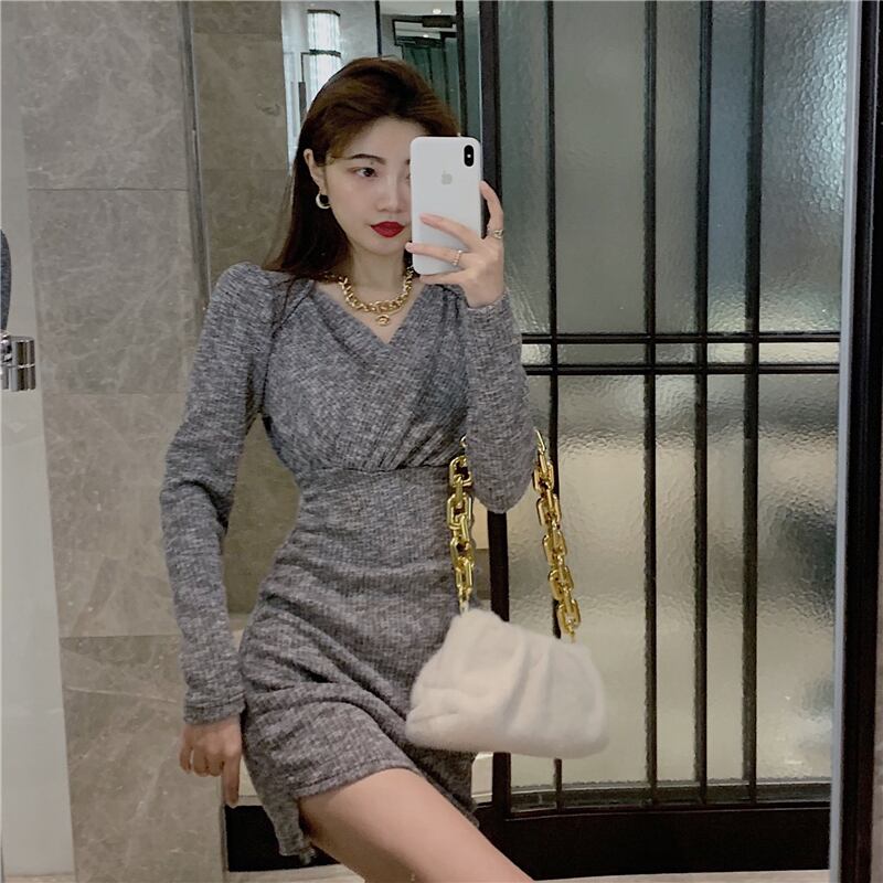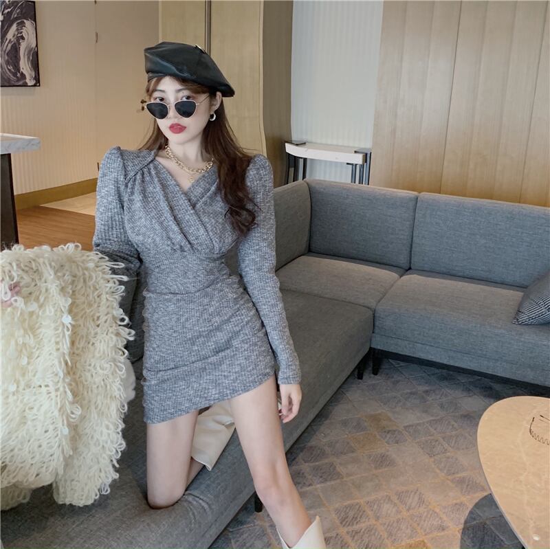 ワンピース タイトワンピース ニットワンピース ミニ丈 長袖 無地 秋 冬 スリム タイト 細身 リブ リブニット きれいめ シンプル おしゃれ お洒落 大人女子 クール セクシー Vネック ミニ ショート ニット ブラック グレー XS S M 20代 30代 女性用 デート お出かけ 女子会 イベント 着回し 普段使い ファッション コーデ スタイル モテ 美脚 脚長 | Rena 韓国ファッション レディースアパレル