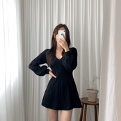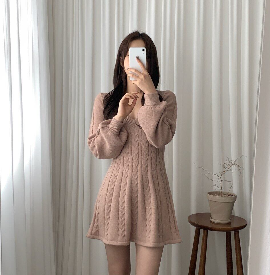 ワンピース ニットワンピース ショート丈 長袖 無地 秋 冬 セミフレア スリム 細身 Aライン ケーブルニット かわいい 大人可愛い きれいめ シンプル カジュアル おしゃれ お洒落 こなれ感 ラブリー キュート ガーリー セクシー Vネック ミニ ショート パフスリーブ ニット ブラック オフホワイト ベージュ ピンク フリーサイズ 10代 20代 女性用 デート お出かけ 女子会 休日 クリスマス バレンタイン 着回し 普段使い ファッション コーデ スタイル あったか 暖かい モテ 美脚 脚長 | Rena 韓国ファッション レディースアパレル