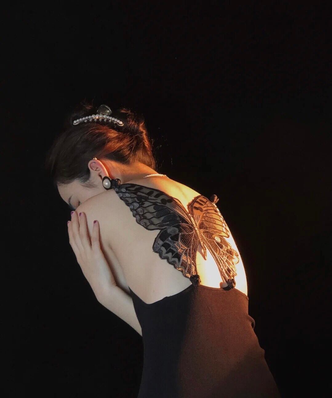 バックスタイルの大きな蝶のモチーフが印象的なデザインドレスです。
