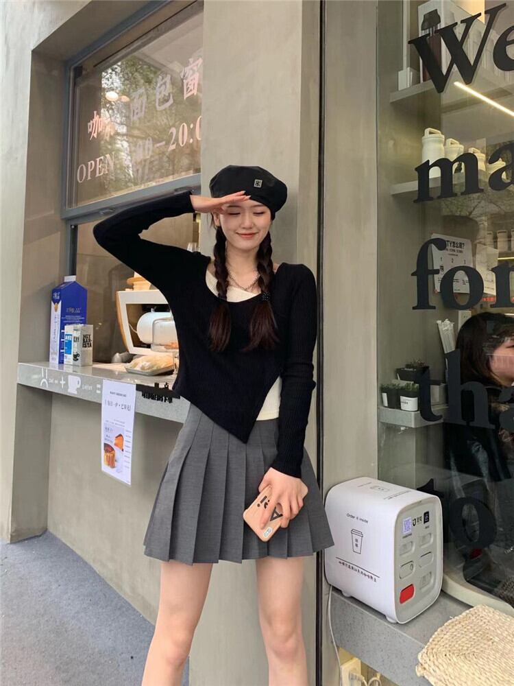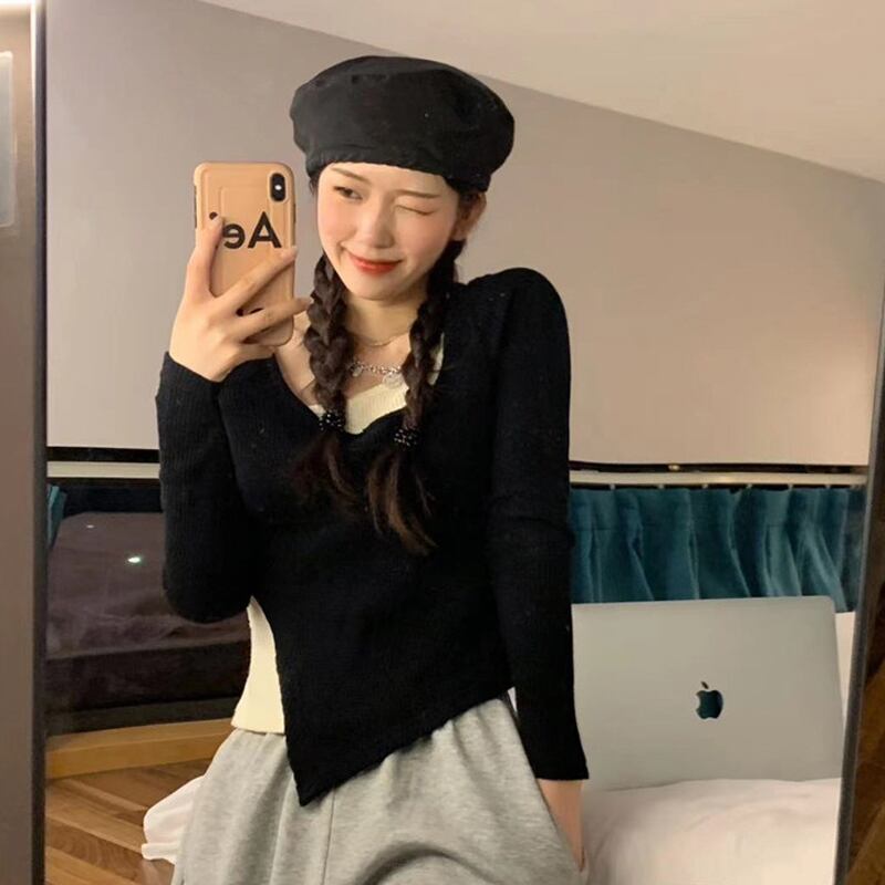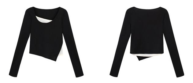 カットソー 長袖 無地 春 秋 ドッキング 重ね着風 かわいい 大人可愛い きれいめ 大人 上品 おしゃれ お洒落 かっこいい 大人女子 個性的 Uネック 黒 ブラック 通勤 学生 通学 デート お出かけ 女子会 普段使い ファッション コーデ スタイル モテ 脚長 送料無料 | Rena 韓国ファッション レディースアパレル