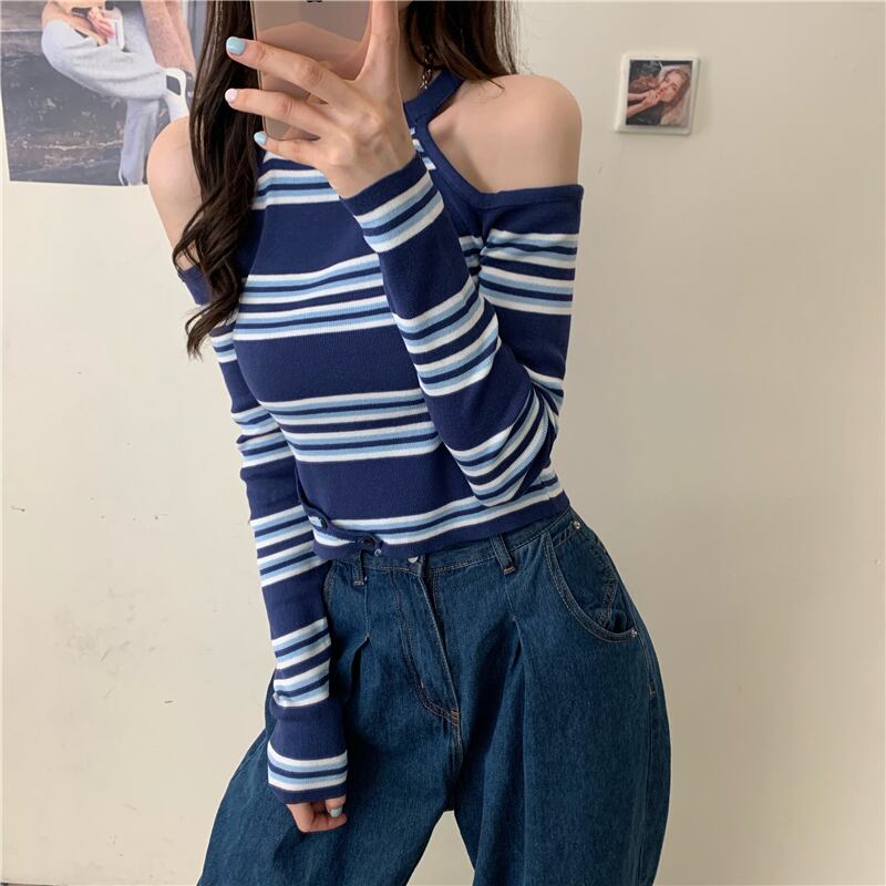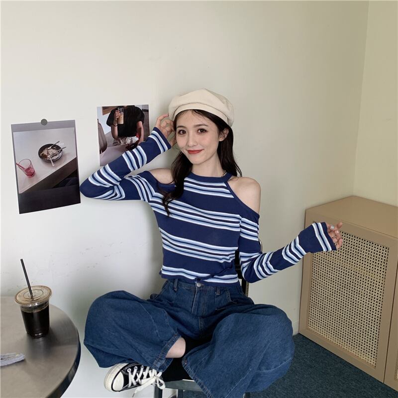 トップス ニット セーター ショート丈 長袖 ボーダー ストライプ 秋 冬 かわいい 大人可愛い カジュアル 大人 おしゃれ お洒落 レトロ 大人女子 こなれ感 ラブリー キュート ガーリー ルーズ 個性的 存在感 オフショルダー オフショル 襟なし 袖あり プルオーバー 厚手 青 ブルー フリーサイズ 大きめ ビッグサイズ ゆったり ゆる 10代 20代 30代 40代 OL 学生 通学 デート お出かけ イベント クリスマス バレンタイン 韓国系 オルチャン 楽ちん モテ 穴あき インスタ映え | Rena 韓国ファッション レディースアパレル