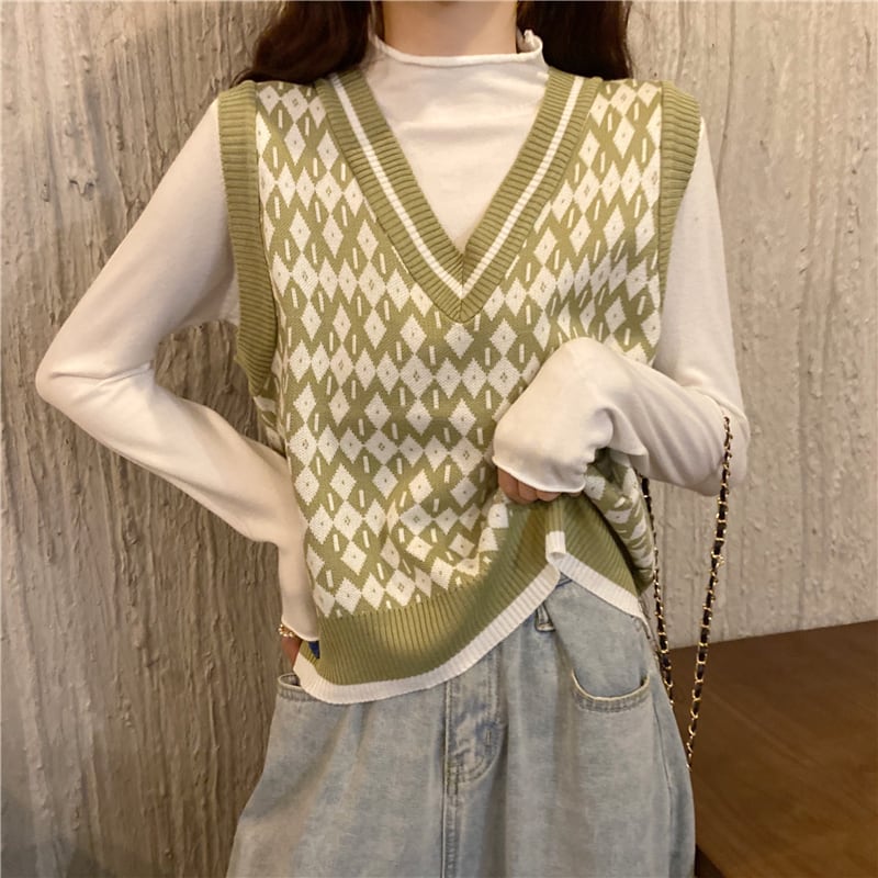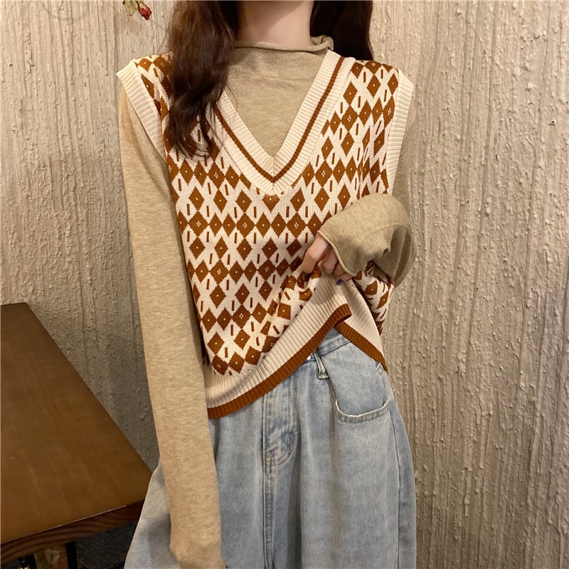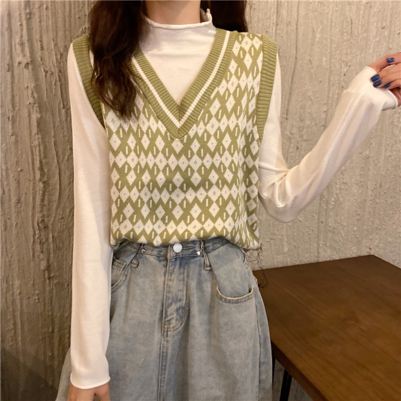 トップス ブラウス ベスト 長袖 柄 秋 冬 リブニット かわいい シンプル カジュアル 大人 おしゃれ お洒落 レトロ こなれ感 ラフ Vネック ハイネック 袖あり ニット 2点セット 黒 ブラック 緑 グリーン 茶色 ブラウン 大人カラー フリーサイズ 10代 20代 30代 40代 オフィス OL 通勤 学生 通学 デート お出かけ 公園デビュー 女子会 イベント バレンタイン 着回し 普段使い 重ね着 お揃い 双子 韓国 韓国系 オルチャン ファッション コーデ 楽ちん 定番 トレンド 流行 | Rena 韓国ファッション レディースアパレル
