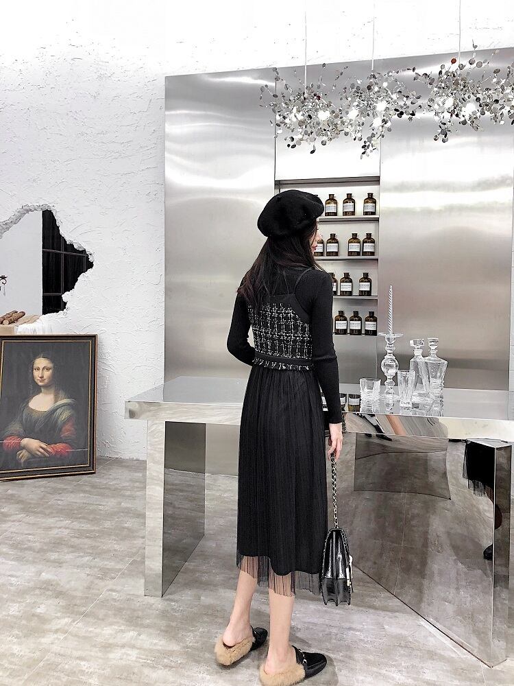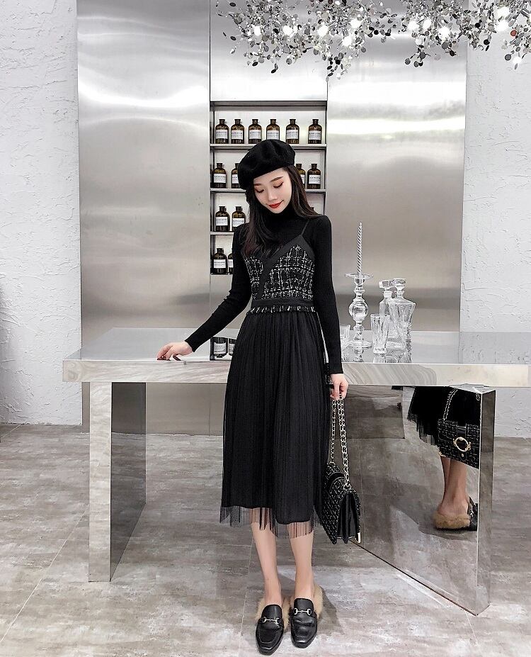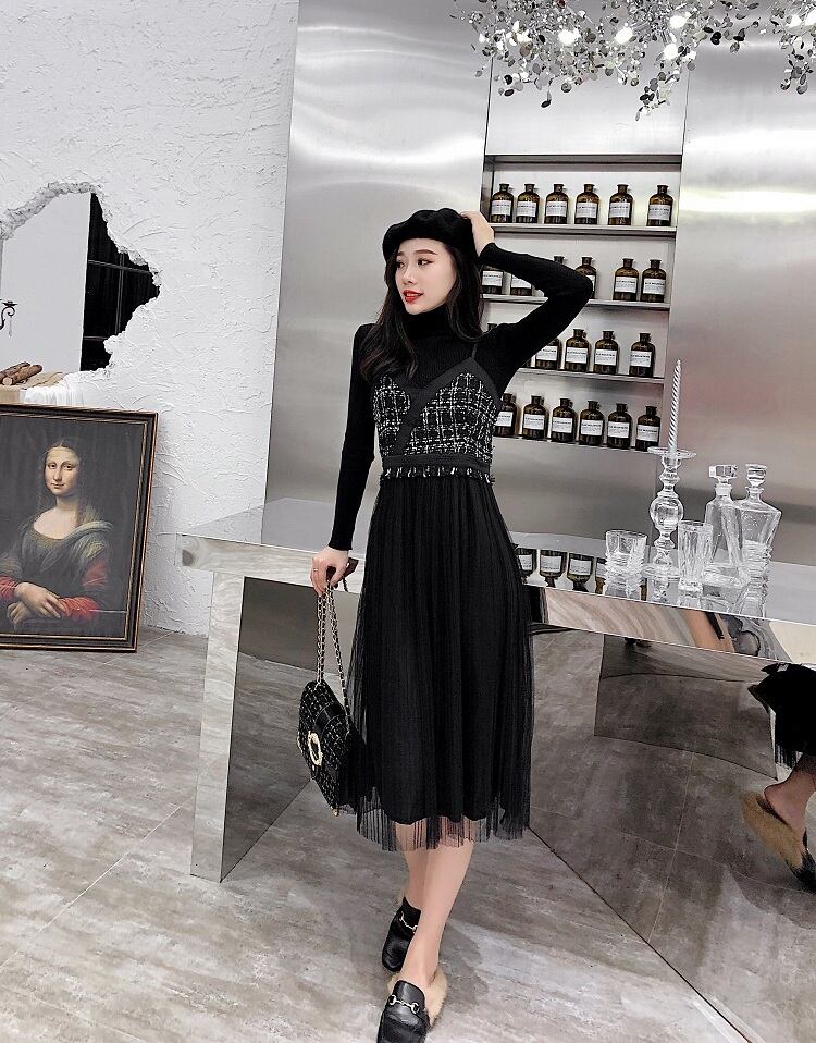 ワンピース ニット ひざ下 ミモレ丈 マキシ丈 長袖 秋 冬 チュール かわいい 大人可愛い 大人 上品 おしゃれ お洒落 大人可愛い 大人女子 キュート ガーリー 袖あり 黒 ブラック S M L XL 10代 20代 30代 デート お出かけ 女子会 休日 パーティー イベント 旅行 ファッション コーデ スタイル 送料無料 | Rena 韓国ファッション レディースアパレル