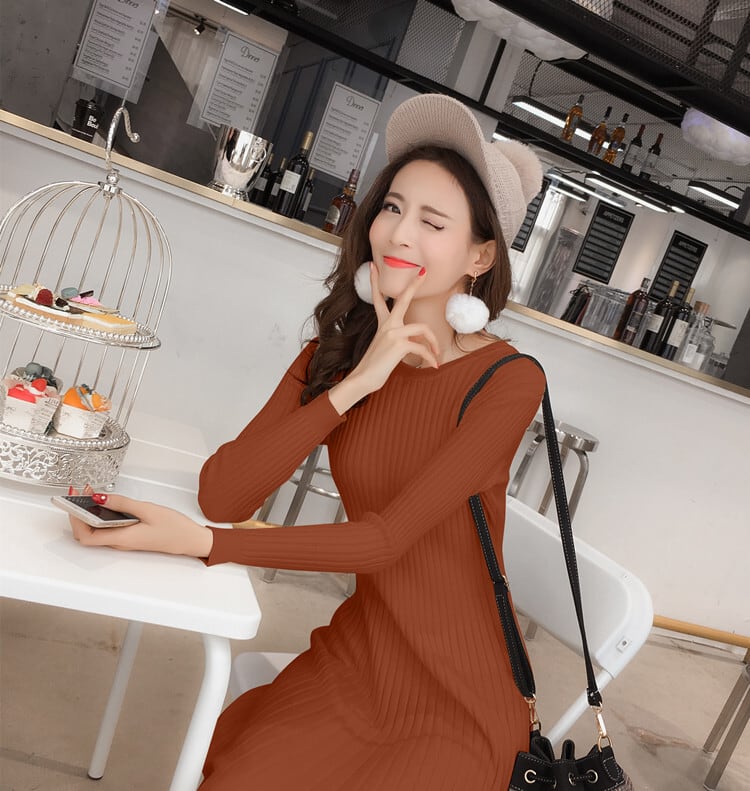ワンピース タイトワンピース ニットワンピース ひざ下 ミモレ丈 長袖 無地 春 秋 冬 スリム タイト 細身 きれいめ シンプル カジュアル 大人 上品 おしゃれ お洒落 大人女子 こなれ感 セクシー ラウンドネック 薄手 白 ホワイト 黒 ブラック 青 ブルー 茶色 ブラウン S M L 10代 20代 30代 40代 オフィス OL 通勤 学生 通学 デート お出かけ 女子会 着回し 重ね着 双子 韓国 韓国系 オルチャン ファッション コーデ スタイル