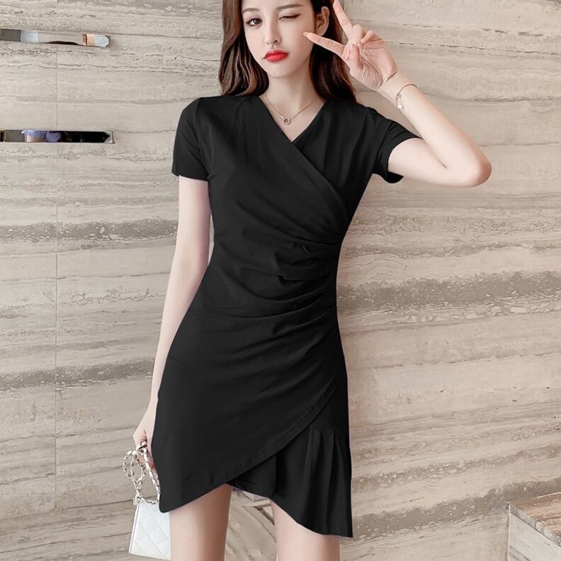 ワンピース カシュクールワンピース タイトワンピース ミニ丈 膝上 半袖 無地 春 夏 スリム タイト 細身 きれいめ シンプル カジュアル 大人 上品 おしゃれ お洒落 かっこいい 大人女子 こなれ感 セクシー 主役級 Vネック 薄手 黒 ブラック 青 ブルー 灰色 グレー S M L XL 10代 20代 30代 40代 OL 学生 通学 デート お出かけ 女子会 誕生日 着回し 重ね着 双子 韓国 韓国系 オルチャン ファッション コーデ スタイル 美脚 脚長 トレンド インスタ映え | Rena 韓国ファッション レディースアパレル