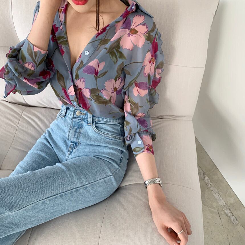 シャツ ブラウス 長袖 花柄 春 秋 かわいい 大人可愛い きれいめ 大人 上品 おしゃれ お洒落 かっこいい レトロ アジアン 大人女子 ラブリー キュート ガーリー Vネック 襟付き 赤 レッド 青 ブルー S M L XL 10代 20代 30代 OL 通勤 学生 通学 デート お出かけ 公園デビュー 女子会 ファッション コーデ スタイル モテ 送料無料 | Rena 韓国ファッション レディースアパレル
