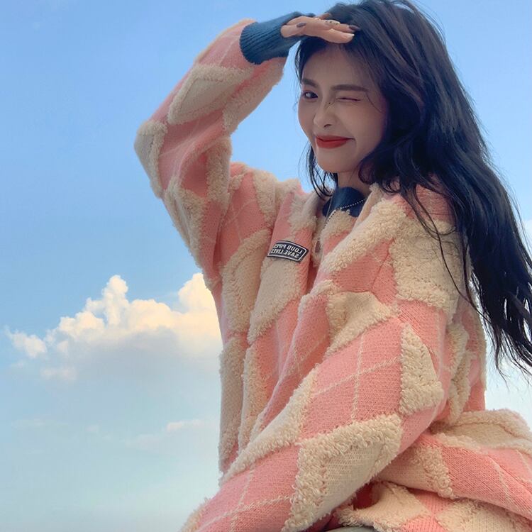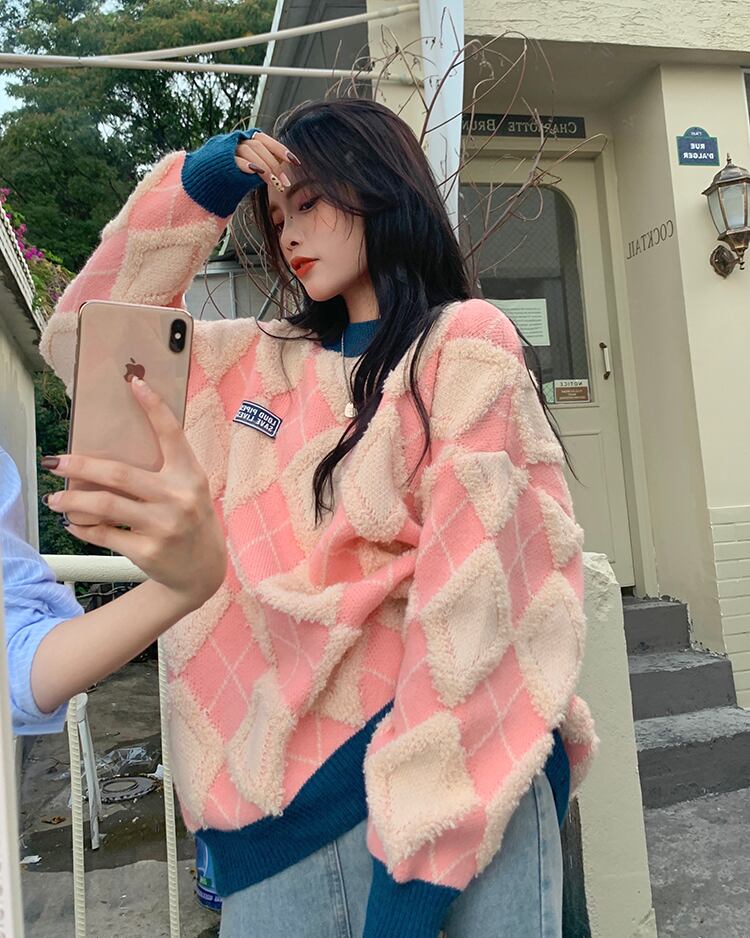 暖かなモコモコの生地に、ダイヤ柄の模様がファッショナブルでオシャレなニットセーターです。