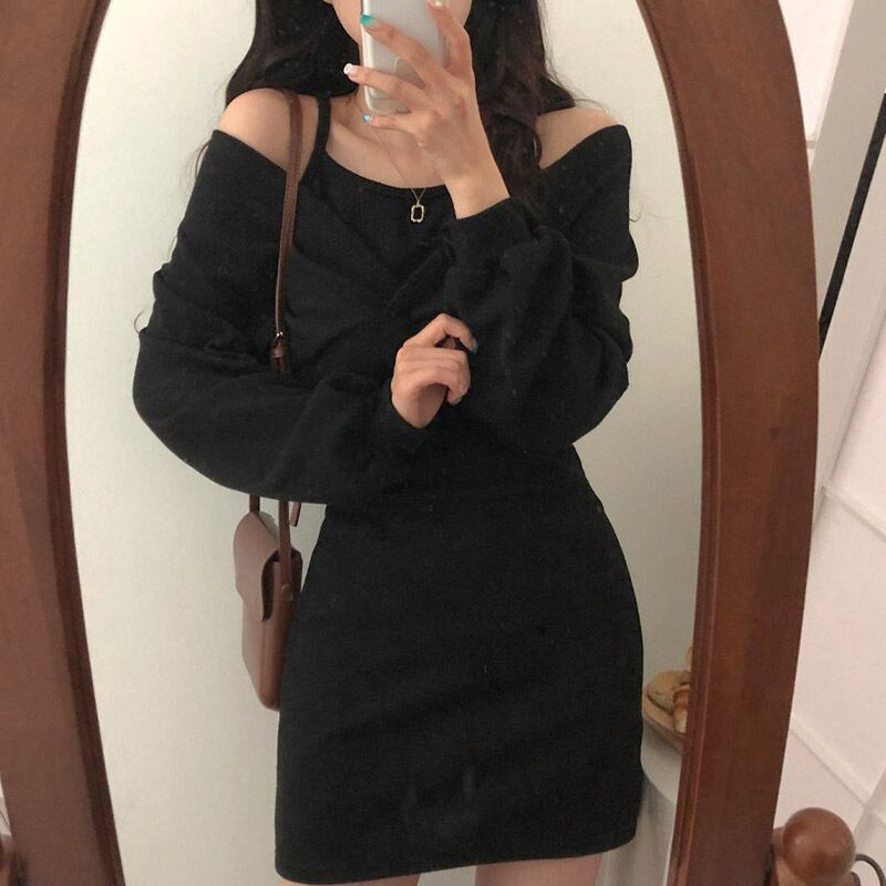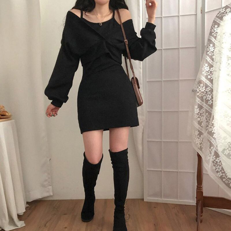 ワンピース レディース ニット タイトワンピース ミニ丈 ショート丈 長袖 無地 春 秋 冬 セミフレア タイト 細身 ストレート Iライン かわいい 大人可愛い きれいめ シンプル カジュアル 大人 上品 おしゃれ お洒落 大人可愛い 大人女子 個性的 セクシー エレガント オフショルダー オフショル ショート 袖あり 2点セット 黒 ブラック 茶色 ブラウン 灰色 グレー S M L 20代 30代 デート お出かけ 女子会 休日 着回し 重ね着 モテ 脚長 送料無料 トレンド 流行 インスタ映え | Rena 韓国ファッション レディースアパレル