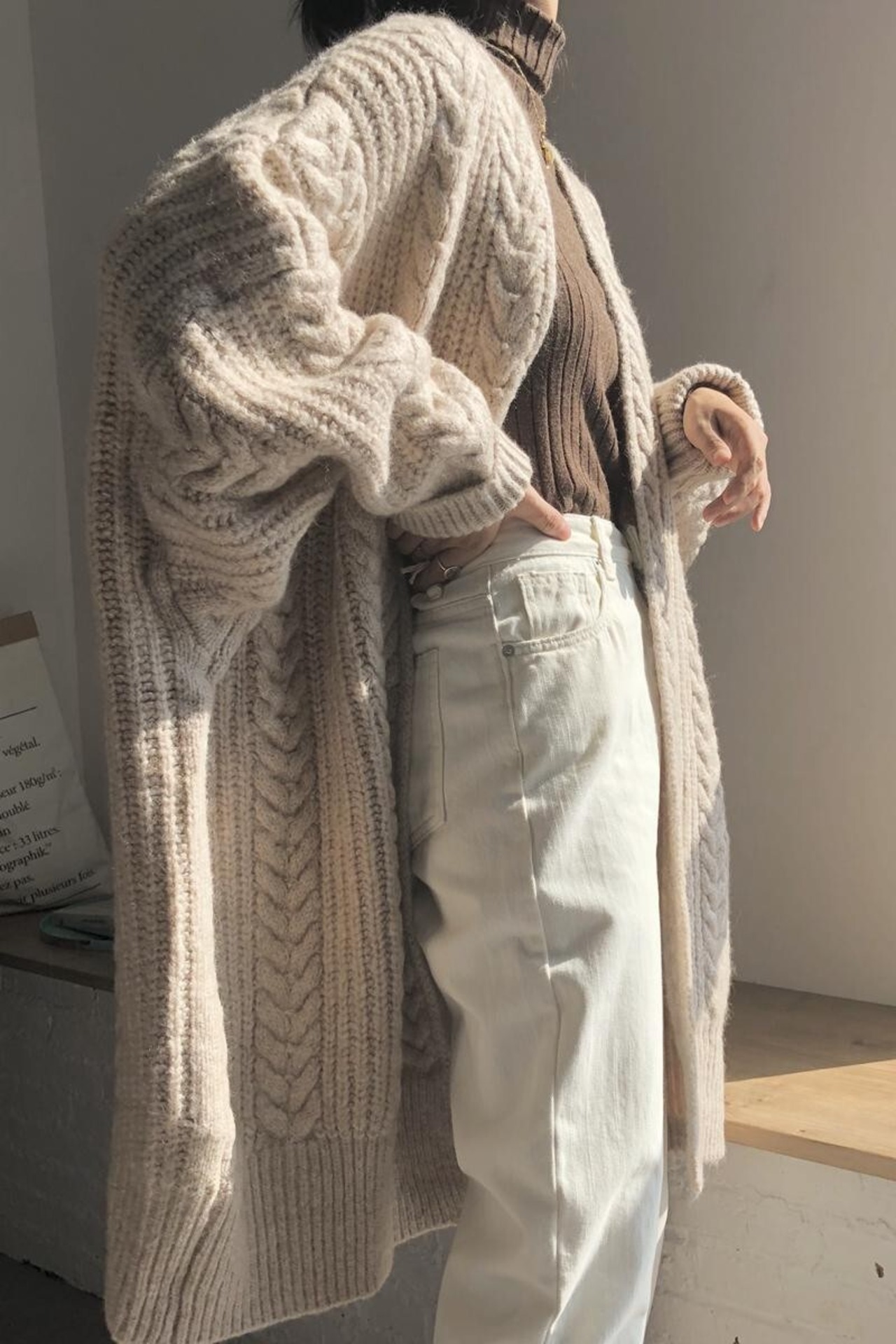 アウター レディース ニット カーディガン ロング丈 長袖 秋 冬 もこもこ モコモコ ケーブルニット かわいい 大人可愛い カジュアル 大人 上品 おしゃれ お洒落 大人女子 こなれ感 ラフ ラブリー キュート ガーリー Vネック 襟なし 白 灰色 グレー オフホワイト S M L XL 10代 20代 30代 40代 50代 60代 OL 通勤 学生 通学 デート お出かけ 公園デビュー 女子会 お泊まり ファッション コーデ スタイル 楽ちん あったか 暖かい 防寒 モテ 送料無料 | Rena 韓国ファッション レディースアパレル