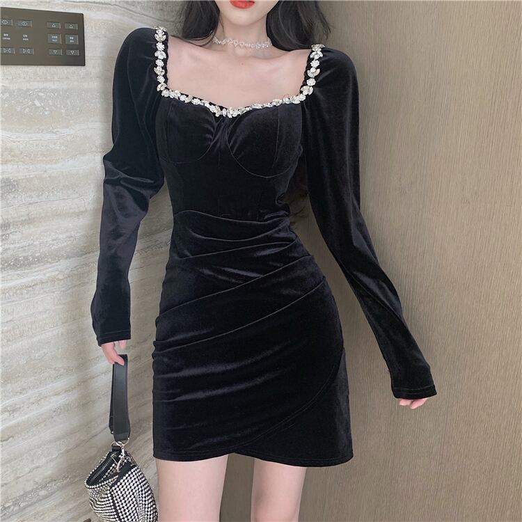 ワンピース フレアワンピース タイトワンピース ミニ丈 長袖 無地 秋 冬 スリム タイト 細身 シャーリング ギャザー ウエストマーク ハイウエスト きれいめ 大人 上品 エキゾチック 大人女子 個性的 クール セクシー エレガント 主役級 存在感 フォーマル スクエアネック ミニ 袖あり 黒 ブラック S M L 10代 20代 30代 女性用 パーティー イベント 結婚式 二次会 披露宴 着回し 普段使い 重ね着 お揃い 双子 韓国 韓国系 オルチャン ファッション モテ 美脚 脚長 送料無料