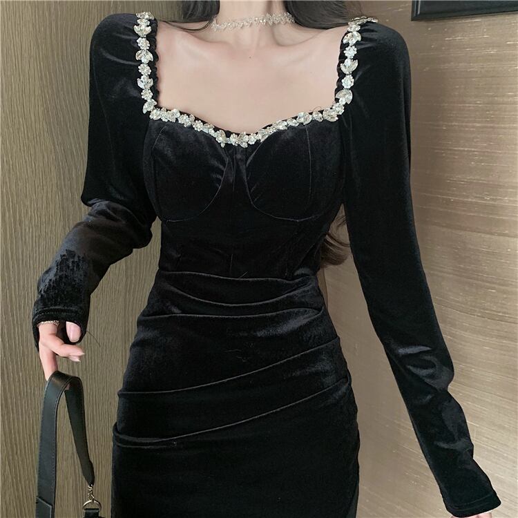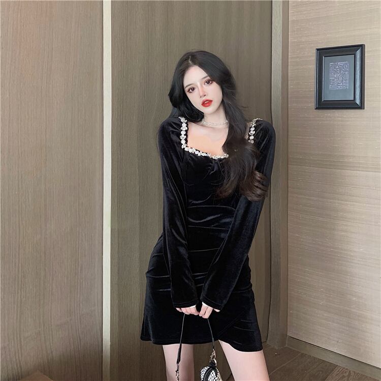 ワンピース フレアワンピース タイトワンピース ミニ丈 長袖 無地 秋 冬 スリム タイト 細身 シャーリング ギャザー ウエストマーク ハイウエスト きれいめ 大人 上品 エキゾチック 大人女子 個性的 クール セクシー エレガント 主役級 存在感 フォーマル スクエアネック ミニ 袖あり 黒 ブラック S M L 10代 20代 30代 女性用 パーティー イベント 結婚式 二次会 披露宴 着回し 普段使い 重ね着 お揃い 双子 韓国 韓国系 オルチャン ファッション モテ 美脚 脚長 送料無料 | Rena 韓国ファッション レディースアパレル