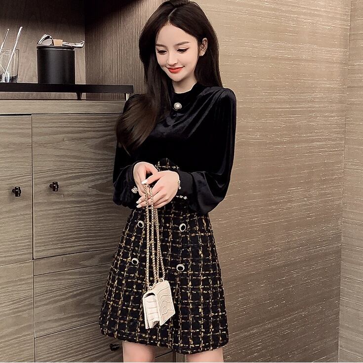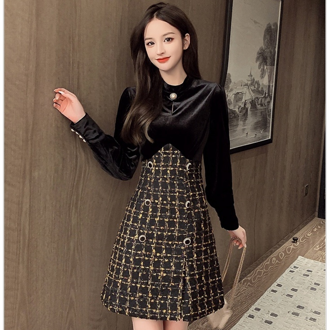光沢のあるブラックブラウスと、暖かみのあるチェックのスカートがドッキングした、シック&キュートなミニワンピースです。