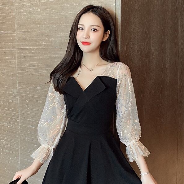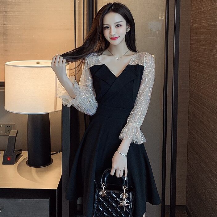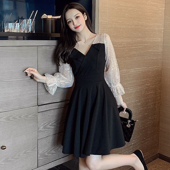 シースルーのスリーブと、シンプルなフレアスカートのワンピースがドッキングした一枚です。