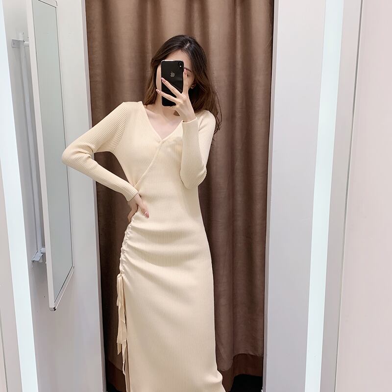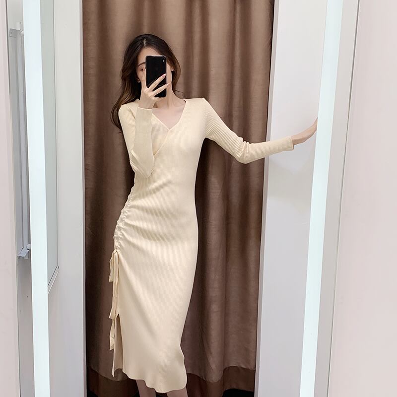 ワンピース レディース ニット タイトワンピース ひざ下 長袖 無地 春 秋 冬 タイト 細身 ストレート Iライン スリット かわいい 大人可愛い きれいめ シンプル カジュアル 大人 上品 おしゃれ お洒落 レトロ 大人可愛い 大人女子 セクシー エレガント Vネック ミモレ 袖あり 白 ホワイト 黒 ブラック 青 ブルー くすみカラー S M L XL 20代 30代 学生 通学 デート お出かけ 女子会 着回し 普段使い 韓国 韓国系 コーデ スタイル 送料無料 トレンド 流行 インスタ映え | Rena 韓国ファッション レディースアパレル