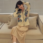ライトブルーとホワイトのアーガイルパターンが爽やかで、ところどころにブドウモチーフの飾りがついていて、ユニークな一枚。