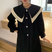 ブラックとホワイトのバイカラーに、大きな襟のデザインが印象的なレディースコートです。