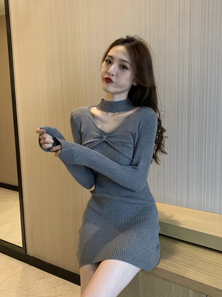 大きくあいた胸元にスリムなシルエットがセクシーで魅力的なニットワンピースです。