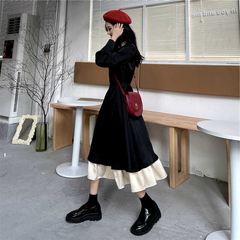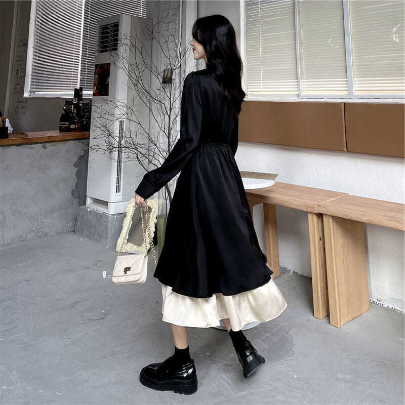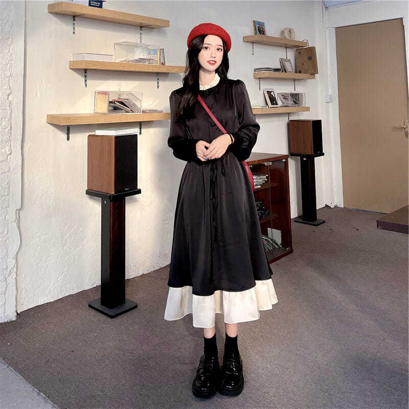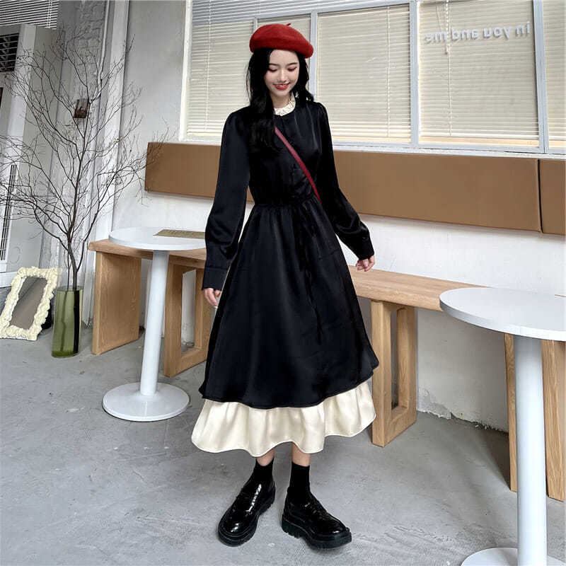 長めの丈に、バイカラーがオシャレで可愛い長袖ドレスです。