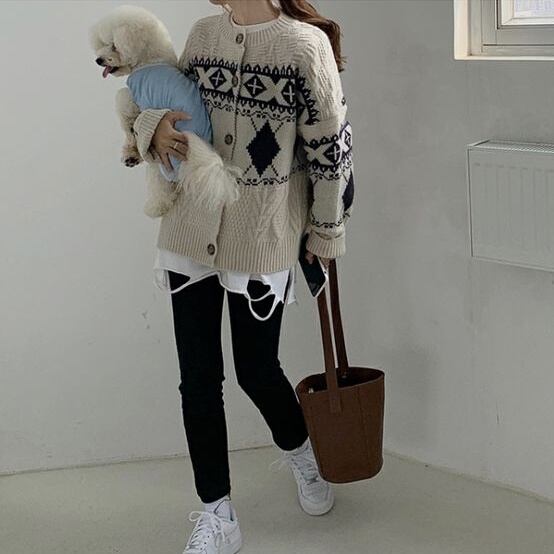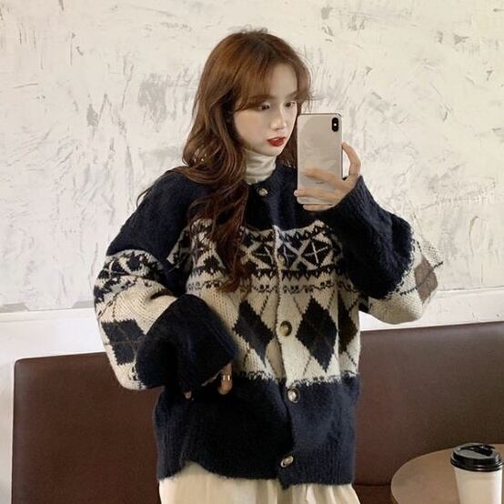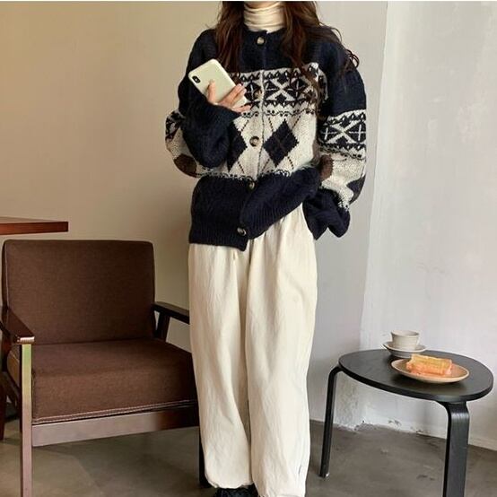 トップス レディース ニット カーディガン 長袖 柄 プリント 秋 冬 Iライン もこもこ 前開き かわいい 大人可愛い きれいめ シンプル カジュアル 大人 上品 お洒落 レトロ 大人女子 クルーネック 袖あり ニット 白 ホワイト ネイビー ベイクドカラー S M L XL 2XL 20代 30代 女性用 通勤 学生 通学 デート お出かけ 女子会 休日 着回し 普段使い 韓国系 オルチャン ファッション コーデ スタイル 楽ちん 暖かい モテ 送料無料 トレンド 流行 インスタ映え | Rena 韓国ファッション レディースアパレル