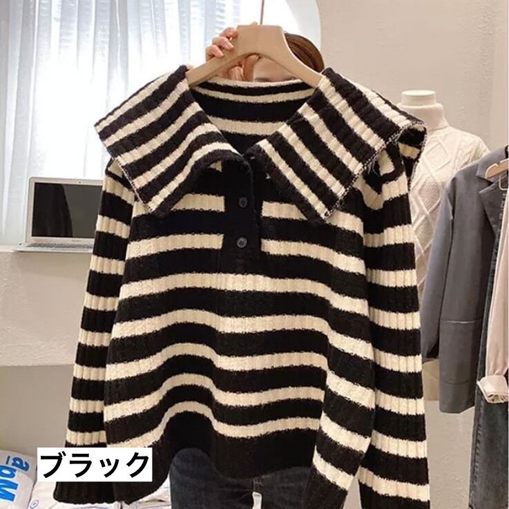ファッショナブルなストライプ柄に、大きな襟がキュートで可愛い、ニットセーターです。