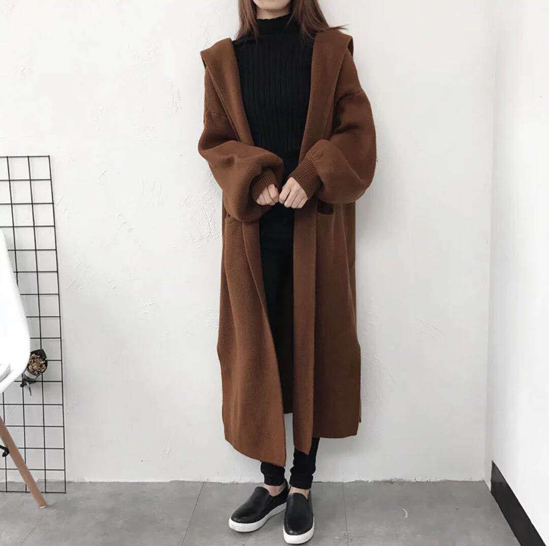 アウター レディース ニット カーディガン コート ロング丈 長袖 秋 冬 フード付き 前開き かわいい 大人可愛い シンプル 大人 上品 おしゃれ お洒落 ラフ キュート ガーリー ルーズ 白 黒 ブラック 茶色 ブラウン オフホワイト ゆったり ゆる 10代 20代 30代 40代 50代 60代 通勤 通学 デート お出かけ 公園デビュー 着回し 普段使い ファッション コーデ スタイル 楽ちん あったか 暖かい 防寒 モテ 送料無料 | Rena 韓国ファッション レディースアパレル