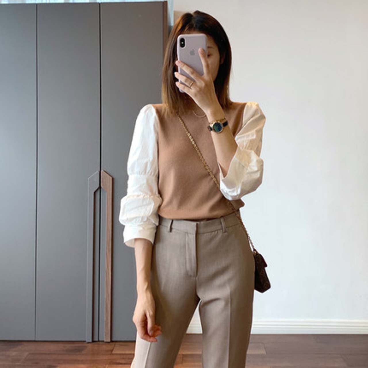 シャツ ブラウス 長袖 無地 春 秋 重ね着風 かわいい 大人可愛い きれいめ シンプル 大人 上品 おしゃれ お洒落 大人女子 こなれ感 ラウンドネック 襟なし 黒 ブラック ベージュ S M L XL 10代 20代 30代 OL 通勤 学生 通学 デート お出かけ 公園デビュー 女子会 着回し 普段使い ファッション コーデ スタイル モテ 送料無料 | Rena 韓国ファッション レディースアパレル