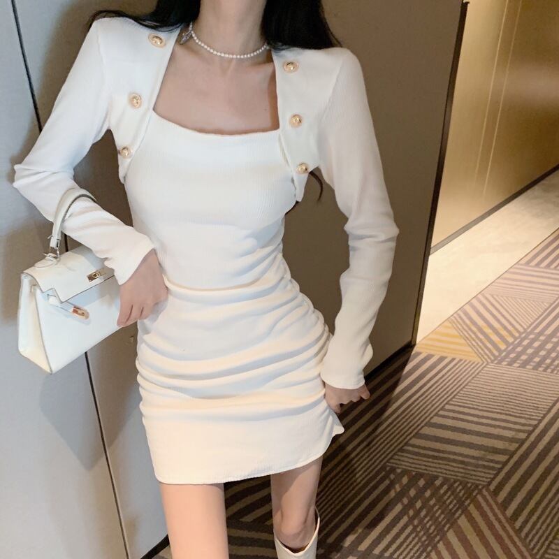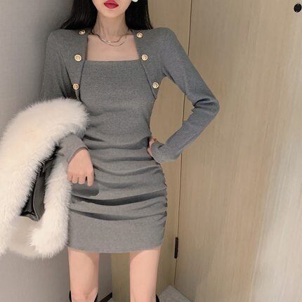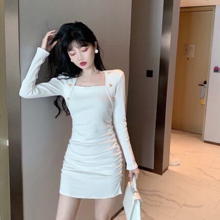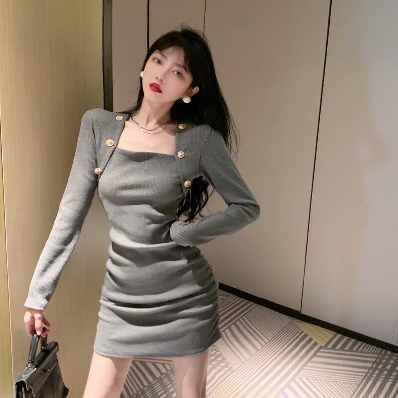 ワンピース ミニワンピース ニットワンピース 長袖 無地 ボタン 春 秋 タイト 重ね着風 きれいめ シンプル 大人 上品 おしゃれ お洒落 大人女子 個性的 セクシー エレガント スクエアネック 白 ホワイト 黒 ブラック 灰色 グレー S M L 20代 30代 40代 通勤 デート お出かけ パーティー イベント ファッション コーデ スタイル モテ 脚長 送料無料 | Rena 韓国ファッション レディースアパレル