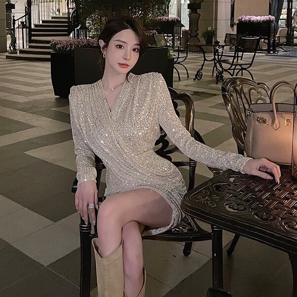 ドレス パーティー レディース タイトワンピース ミニ丈 ショート丈 長袖 無地 春 秋 冬 スリム タイト 細身 ストレート Iライン かわいい 大人可愛い きれいめ 大人 上品 おしゃれ お洒落 かっこいい 大人可愛い 大人女子 個性的 クール モード系 エレガント 主役級 存在感 とろみ感 Vネック ショート 袖あり 光沢 メタリック ワンサイズ 20代 30代 女子会 パーティー イベント リゾート 韓国 韓国系 ファッション コーデ スタイル 楽ちん モテ 送料無料 トレンド 流行 インスタ映え | Rena 韓国ファッション レディースアパレル