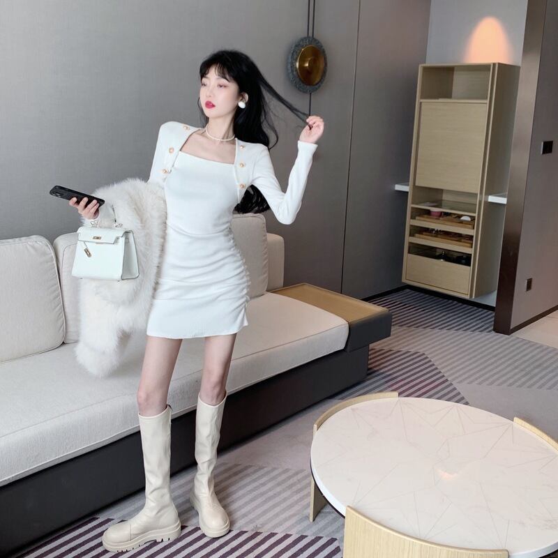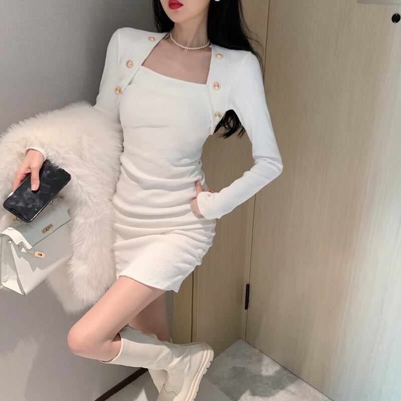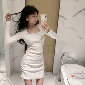 ワンピース タイトワンピース ミニ丈 長袖 無地 春 秋 冬 スリム タイト 細身 シンプル 大人 おしゃれ かっこいい 大人女子 クール セクシー スクエアネック 襟なし ミニ 袖あり 白 ホワイト 黒 ブラック 灰色 グレー S M L 10代 20代 30代 40代 学生 通学 デート お出かけ 女子会 パーティー イベント 韓国系 ファッション コーデ スタイル 美脚 脚長 プチプラ 送料無料 | Rena 韓国ファッション レディースアパレル