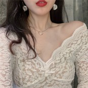 ブラウス カットソー 長袖 春 秋 冬 スリム 細身 レース 透け感 かわいい 大人可愛い きれいめ 上品 おしゃれ 大人女子 キュート セクシー エレガント Vネック 白トップス 薄手 白 ホワイト 黒 ブラック S M L XL 大きいサイズ 10代 20代 30代 40代 50代 オフィス ビジネス OL 通勤 学生 通学 デート お出かけ 着回し 重ね着 韓国系 ファッション コーデ プチプラ 送料無料 | Rena 韓国ファッション レディースアパレル