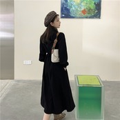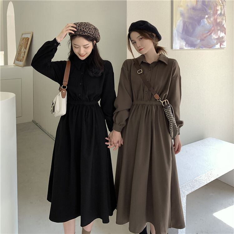 ワンピース レディース シャツワンピース ミモレ丈 長袖 無地 秋 フレア 細身 裾フレア シフォン かわいい 大人可愛い きれいめ シンプル カジュアル 大人 上品 おしゃれ お洒落 レトロ 大人可愛い 大人女子 個性的 Uネック ミモレ 袖あり 黒 ブラック 茶色 ブラウン ワンサイズ 20代 30代 オフィス ビジネス OL 通勤 学生 通学 デート お出かけ 女子会 休日 着回し 普段使い 韓国 韓国系 オルチャン ファッション コーデ 送料無料 トレンド 流行 インスタ映え | Rena 韓国ファッション レディースアパレル