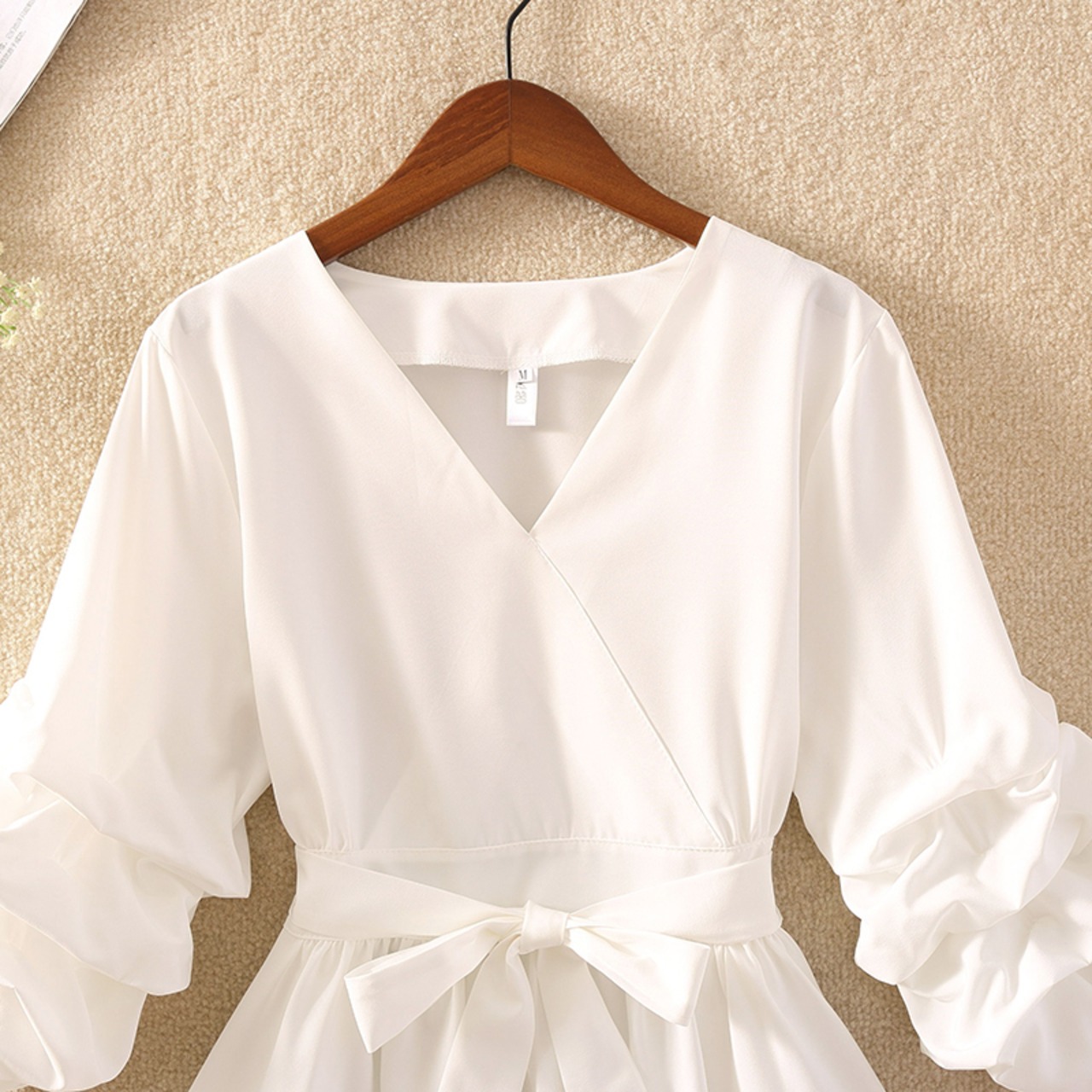 シャツ ブラウス 長袖 無地 春 秋 裾フレア ウエストマーク かわいい 大人可愛い きれいめ シンプル 大人 おしゃれ 大人女子 キュート ガーリー エレガント Vネック スクエアネック ボリューム袖 白シャツ 白トップス 白 ホワイト S M L XL 大きいサイズ 10代 20代 30代 40代 50代 オフィス ビジネス OL 通勤 学生 通学 デート お出かけ 着回し 韓国系 ファッション モテ 体系カバー 定番 プチプラ 送料無料 | Rena 韓国ファッション レディースアパレル