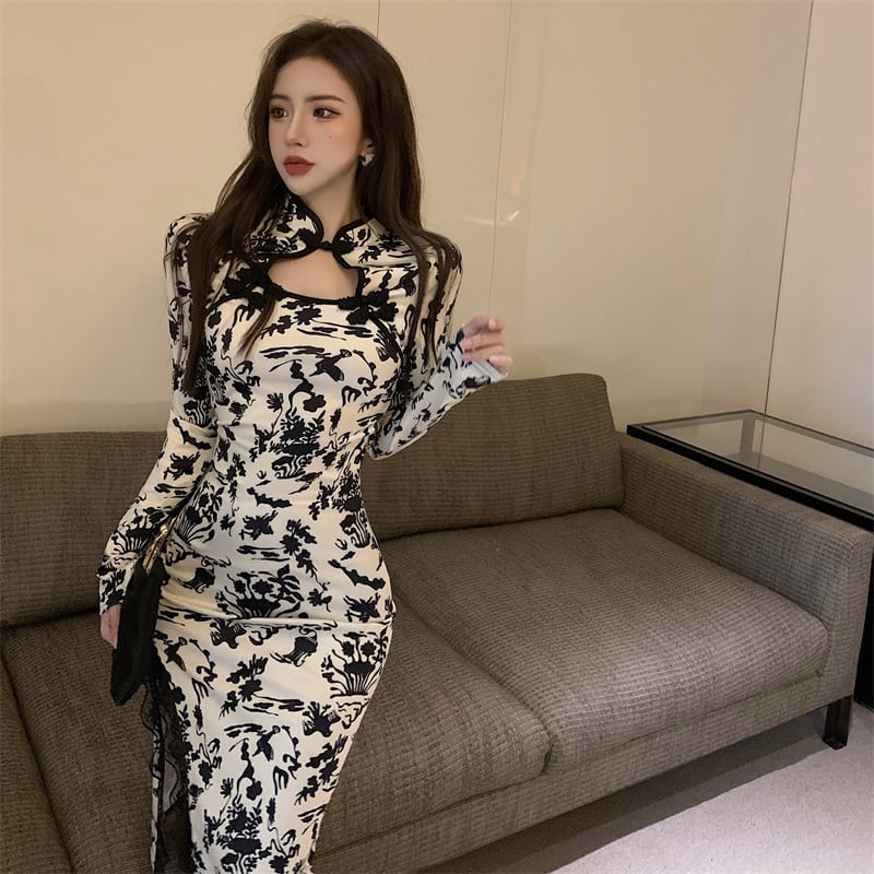 ワンピース タイトワンピース ひざ下 長袖 柄 春 夏 秋 冬 スリム タイト 細身 スリット サイドスリット きれいめ 大人 上品 おしゃれ かっこいい 大人女子 個性的 クール セクシー エレガント モダン 主役級 ミモレ 袖あり ワンピドレス 大人カラー モノトーン S M L XL 大きいサイズ 10代 20代 30代 40代 パーティー イベント オールシーズン 二次会 ファッション スタイル 美脚 脚長 プチプラ 送料無料 インスタ映え | Rena 韓国ファッション レディースアパレル