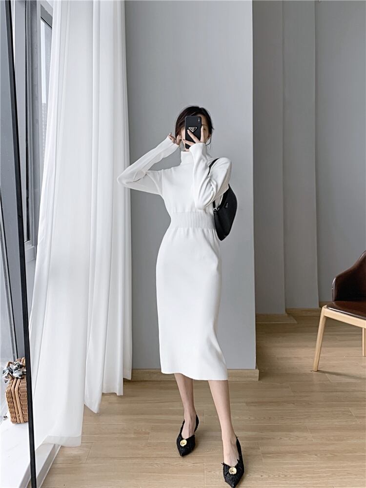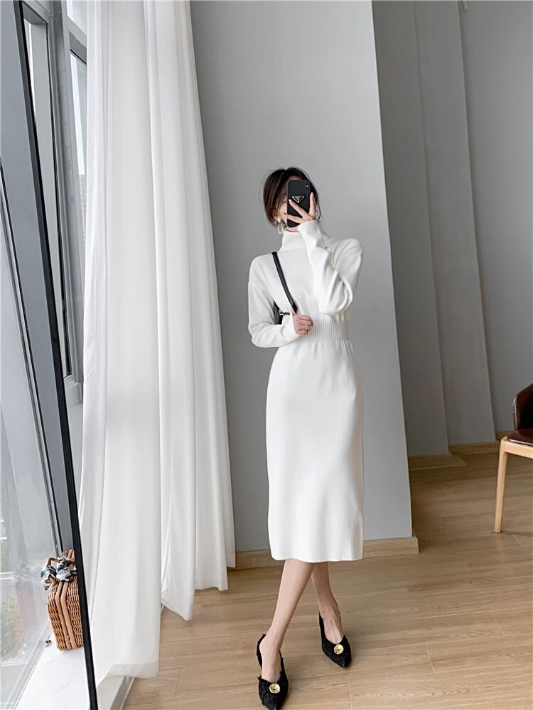 ワンピース ニット ミモレ丈 長袖 無地 秋 冬 ウエストマーク かわいい 大人可愛い きれいめ シンプル 大人 上品 おしゃれ 大人女子 クール エレガント タートルネック ミモレ 白 ホワイト 黒 ブラック S M L XL 大きいサイズ 10代 20代 30代 40代 50代 オフィス ビジネス OL 通勤 学生 通学 デート お出かけ 女子会 普段使い ファッション コーデ あったか モテ 定番 プチプラ 送料無料 | Rena 韓国ファッション レディースアパレル