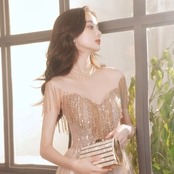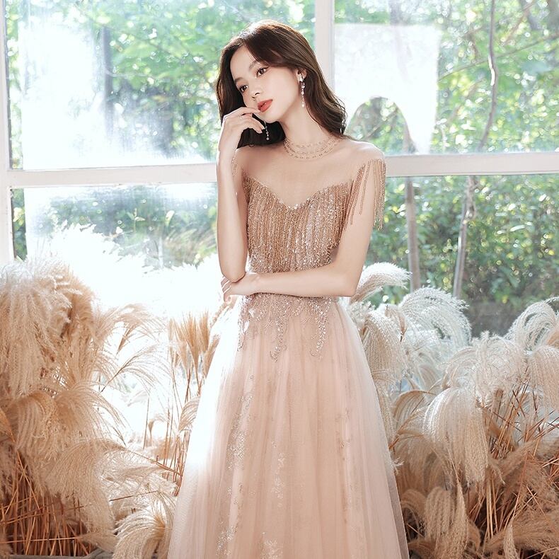 高級感あふれるシャンパンカラーに、華やかに散りばめられたスパンコールがエレガントで魅力的なドレスです。