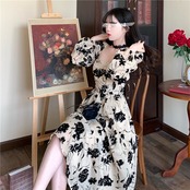 ワンピース レディース フレアワンピース ミモレ丈 長袖 柄 花柄 フラワー 春 秋 セミフレア Aライン シフォン ふわふわ かわいい 大人可愛い きれいめ シンプル カジュアル 大人 上品 おしゃれ お洒落 大人可愛い 大人女子 個性的 セクシー エレガント スクエアネック ミモレ 袖あり くすみカラー 大人カラー S M L XL 20代 30代 デート お出かけ 女子会 休日 パーティー イベント リゾート 着回し 普段使い 韓国 韓国系 オルチャン 送料無料 トレンド 流行 インスタ映え