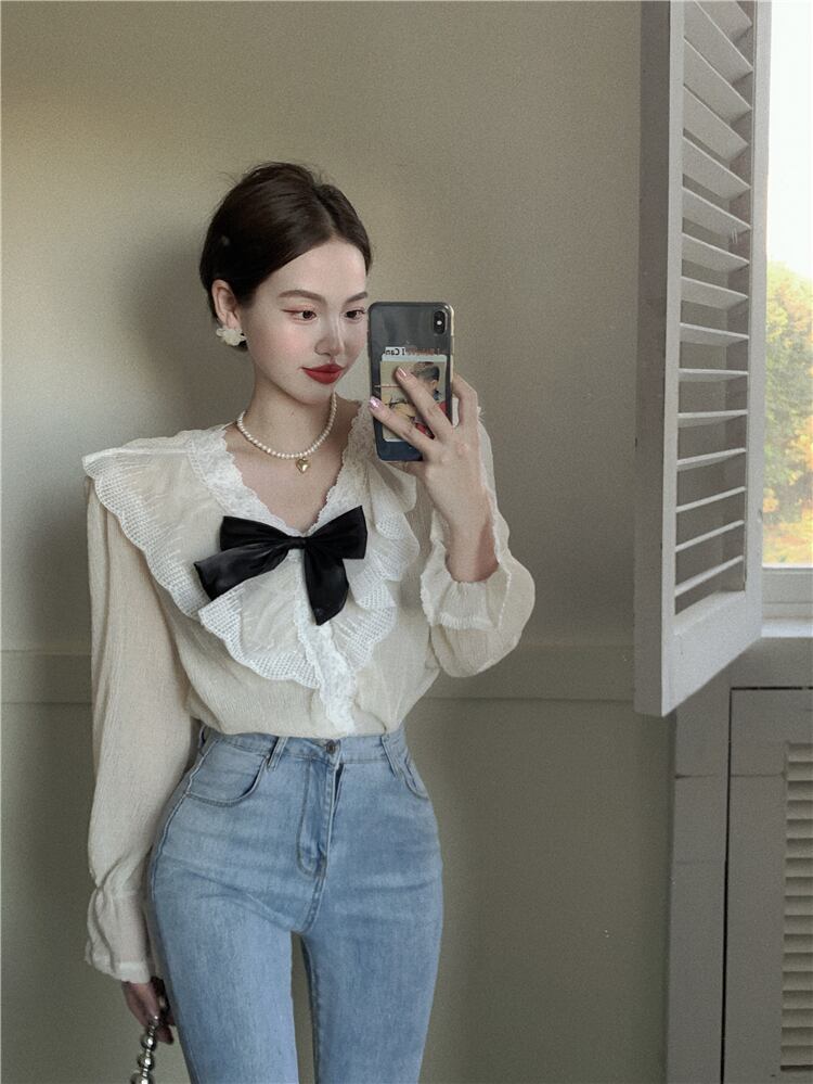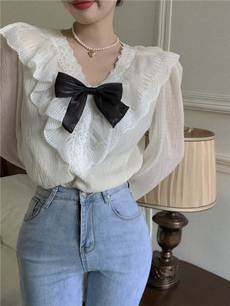 シャツ ブラウス 長袖 春 秋 レース フリル リボン 透け感 シースルー かわいい 大人可愛い おしゃれ 大人女子 ラブリー キュート ガーリー エレガント とろみ感 Vネック 襟付き 白トップス 白 ホワイト S M L 10代 20代 30代 40代 OL 通勤 学生 通学 デート お出かけ 女子会 パーティー イベント 着回し 普段使い 韓国系 ファッション プチプラ 送料無料 インスタ映え | Rena 韓国ファッション レディースアパレル