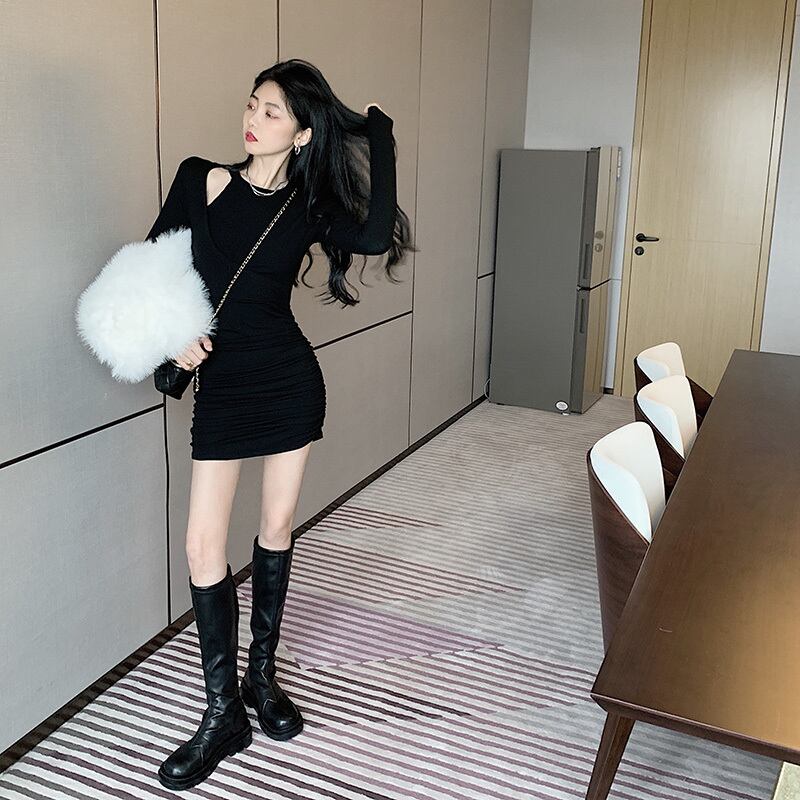 ワンピース タイトワンピース ミニ丈 長袖 無地 春 秋 冬 スリム タイト 細身 かわいい シンプル 大人 おしゃれ かっこいい 大人女子 クール セクシー エレガント 主役級 ミニ 黒 ブラック モノトーン S M L 10代 20代 30代 40代 学生 通学 デート お出かけ パーティー イベント 旅行 韓国系 ファッション コーデ スタイル 美脚 脚長 プチプラ 送料無料 インスタ映え