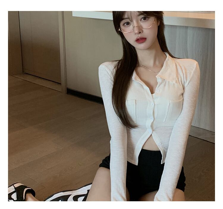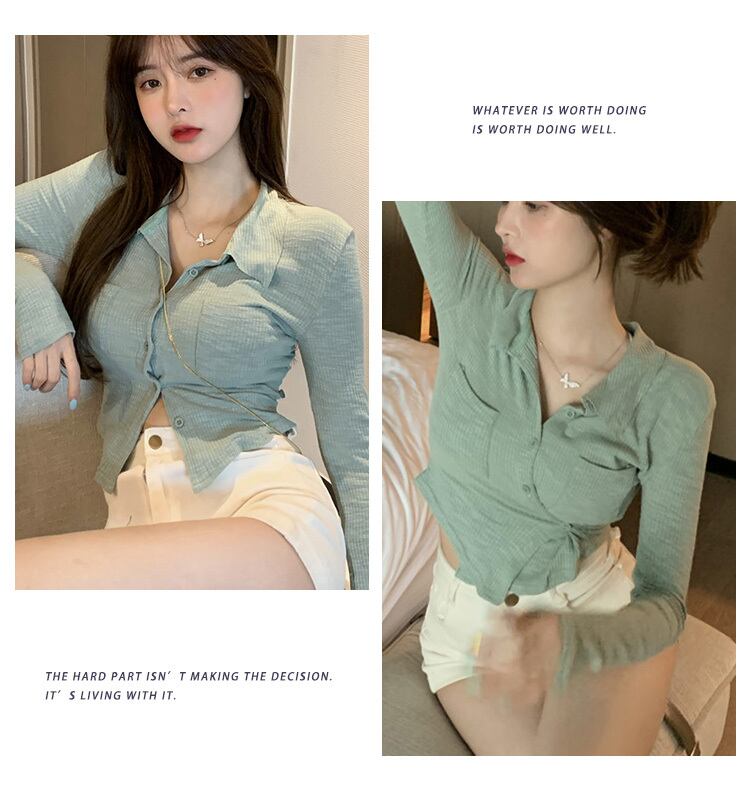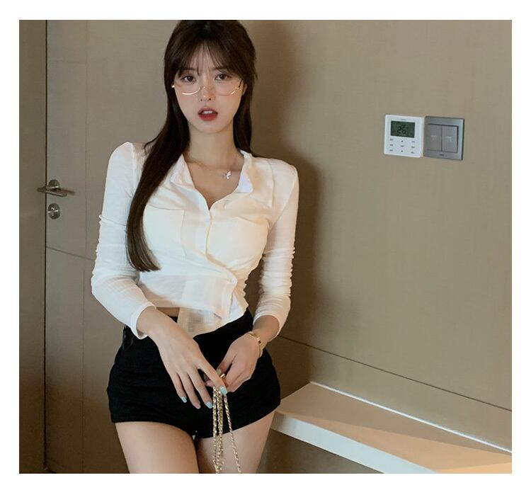 シャツ ブラウス ショート丈 長袖 無地 春 夏 秋 スリム タイト 細身 アシンメトリー 前開き かわいい 大人可愛い シンプル おしゃれ かっこいい 大人女子 こなれ感 ラブリー キュート クール セクシー Vネック 襟付き 白シャツ 白 ホワイト 黒 ブラック 緑 グリーン S M L 10代 20代 30代 40代 学生 通学 デート お出かけ 女子会 休日 リゾート 旅行 着回し 韓国系 ファッション コーデ スタイル モテ プチプラ 送料無料 | Rena 韓国ファッション レディースアパレル